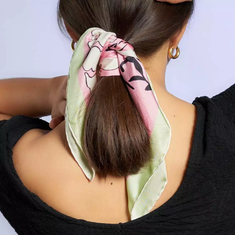 L’idée coiffure la plus simple à faire ! Faites une queue de cheval ou une tresse, que vous nouez avec un élastique. Pliez votre petit gavroche en soie en un bandeau large de 10 cm, puis nouez-le autour de votre élastique. Un seul nœud bien serré suffira pour le faire tenir. Arrangez les deux pans de part et d’autre de votre coiffure. Le tour est joué, sans même avoir besoin de miroir !
